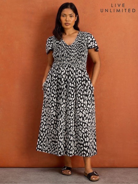 Live Unlimited Black Animal Print Shirred Midi Dress