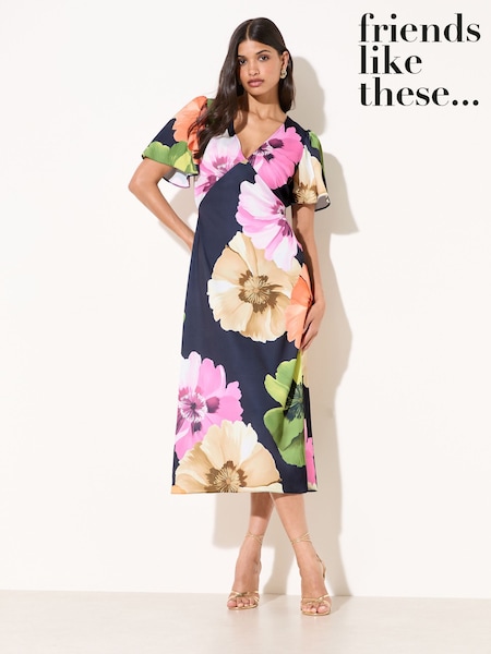 Friends Like These Navy V-Neck Floral Printed Satin Midi Dress