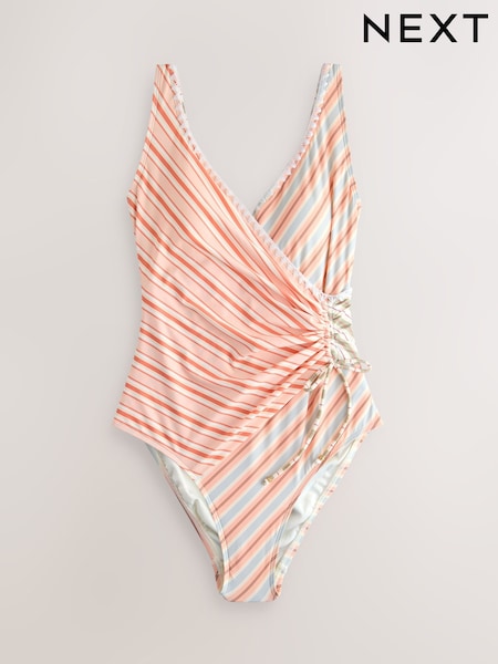 Peach Pink Stripe Whipstitch Ruched Side Tummy Shaping Control Swimsuit