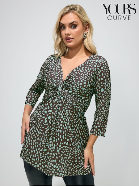 Yours Curve Chocolate Brown Markings Print London Knot Front Tunics
