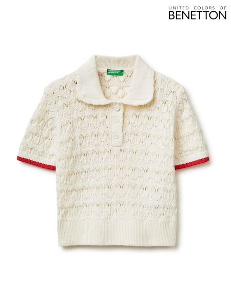 Benetton צבע לבן חולצת פולו סרוגה