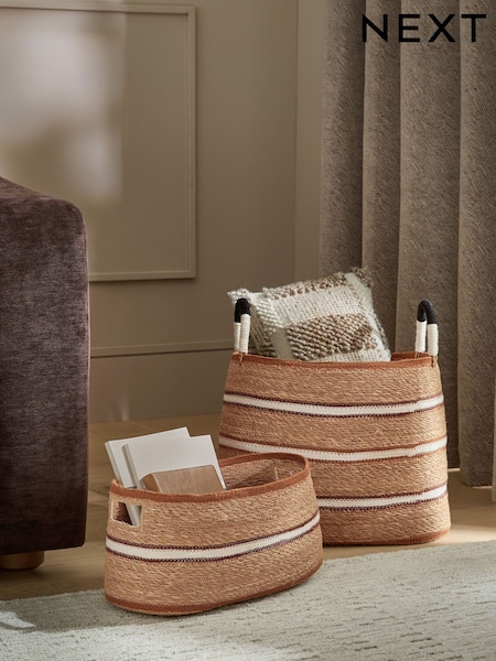 סט הכולל 3 סלי אחסון בדוגמת פסים ובעיטור בד מכווץ