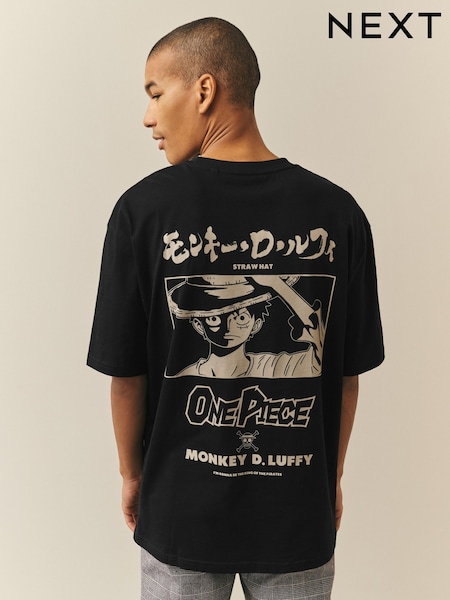 צבע שחור בדוגמת הוקוסאי - גזרה רפויה - חולצת טי עם הדפס אומנותי ברישיון