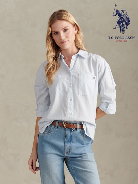 כחול - .U.S. Polo Assn חולצת אוקספורד פסים סטרץ' בגזרה קלאסית לנשים