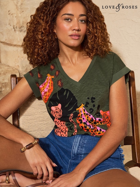מנומר ירוק - Love & Roses חולצה עם צווארון וי ועיטור פייטים