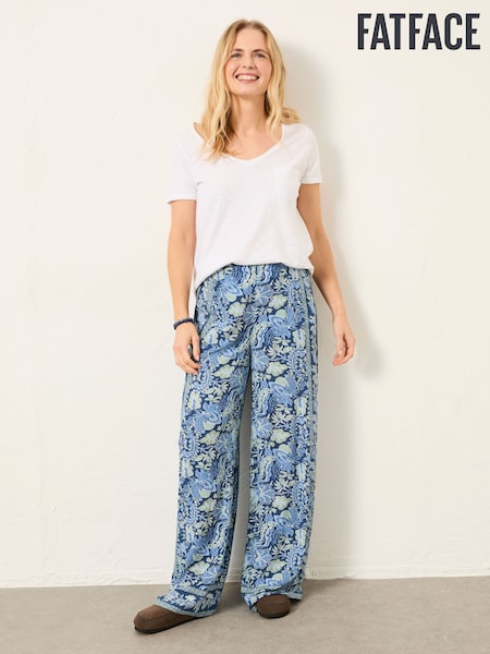 צבע כחול בהיר, בדוגמה פרחונית בלינזית - FATFACE מכנסי פלאצו בגזרה רחבה